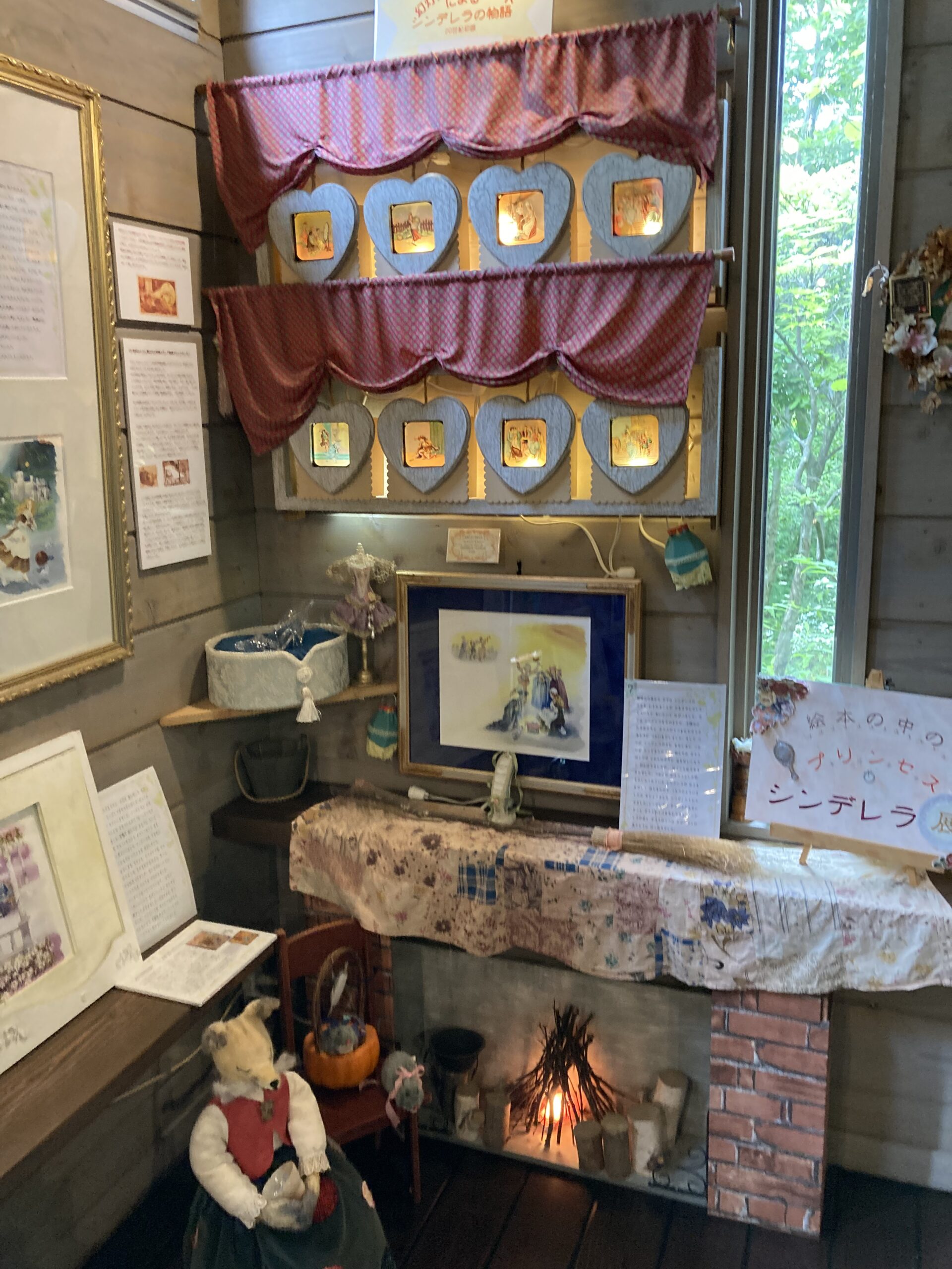 暖炉の上にあるハートのフレームの中には、シンデレラのシーンを描いたステンドグラスが埋め込まれていました。ここでは文字や音がなくても物語を楽しむことができます^^