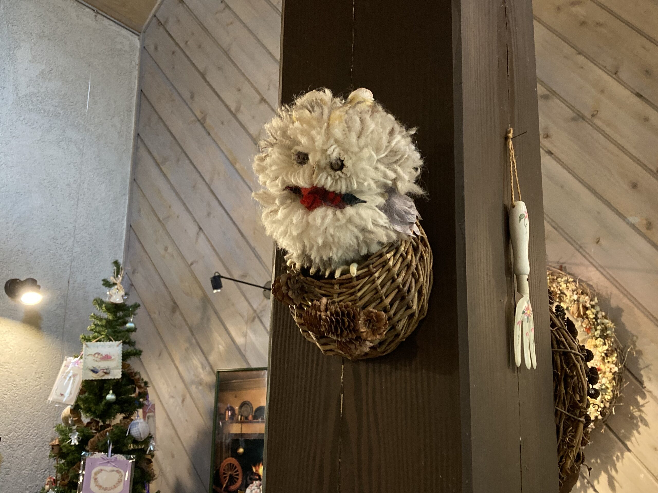 お人形に造花にプーさん・・・フクロウの絵画がかかっている扉の向こうはトイレなんですが、そこだけ木が斜め張りなのもオシャレですよね。