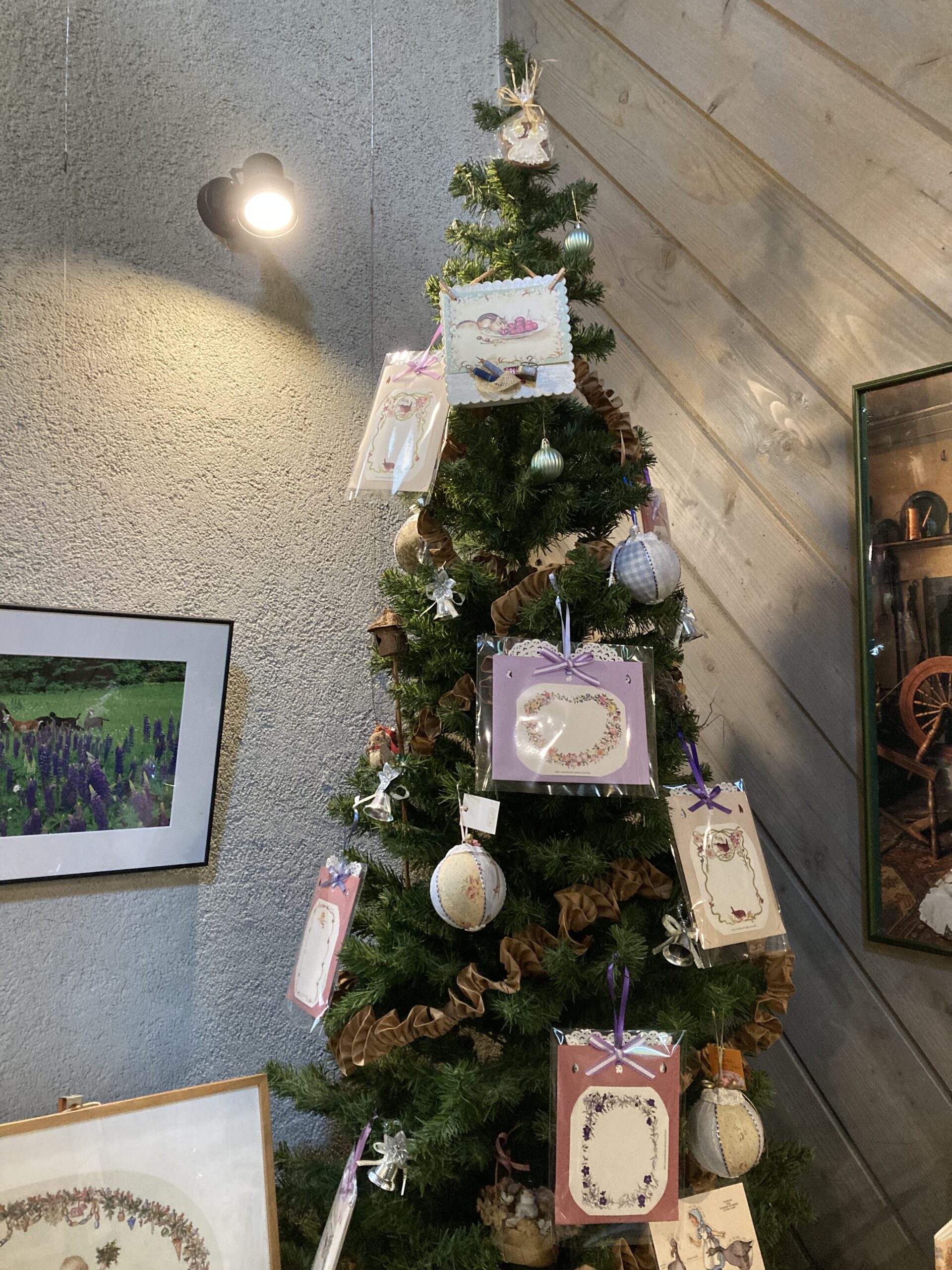 写真のツリーには、ターシャさんのポストカードが吊るしてありました。なるほど、カードをオーナメントとして使うのも素敵だな〜。インテリアの参考にもなります!